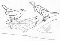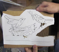 Next I started drawing the real design with pencil on paper, starting with the branch and nest. The nest texture is made from a number of cuts that are just the width of the scroll saw blade. There's always going to be a little round hole at the end of each cut because you have to drill a hole to get the scroll saw blade to go through. With a scroll saw design, you always have to think, "if I cut here, will it fall apart?" If any of those lines went all the way across the nest, the top would fall off. I found lots of bird pictures. I drew/traced the outlines and decided where to cut, to show the bird features. I scanned, edited in Photoshop, and printed a few times to clean a few things up and make it the right size.