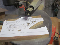 Here you can see the wood sitting on the scroll saw table. The blade is the black vertical line, 1/16" wide with cutting teeth on the front side. The saw moves it up and down, sort of like a sewing machine, and you slide the wood forward and backward and around on the table while the blade does its work. Because the blade is so small, it's easy to cut round shapes, or pretty much any shape you like.